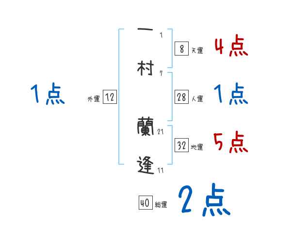 天運![]() | 一村蘭逢さんの天運は8画の4つ星!勤勉家。根気強く努力し成功する。忍耐力がある。 家系が持つ宿命的な運勢を表します。祖先から受け継いだ苗字ですので自分の力が及びません。家柄を象徴します。 |