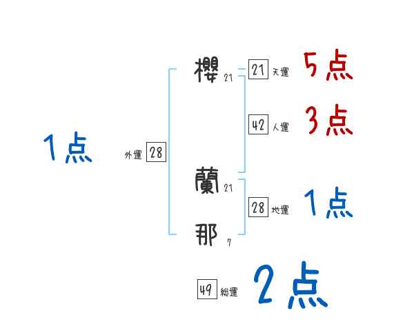 天運![]() | 櫻蘭那さんの天運は21画の5つ星!統率力がある。独立し成功する。名誉を手に入れる。 家系が持つ宿命的な運勢を表します。祖先から受け継いだ苗字ですので自分の力が及びません。家柄を象徴します。 |