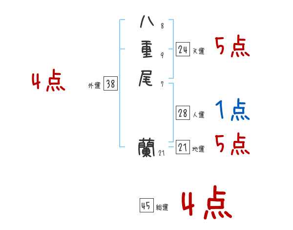 天運![]() | 八重尾蘭さんの天運は24画の5つ星!家庭運が良く順調な人生。金運にも恵まれる。 家系が持つ宿命的な運勢を表します。祖先から受け継いだ苗字ですので自分の力が及びません。家柄を象徴します。 |