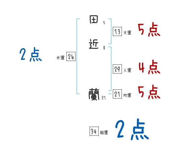 総運![]() | 田近蘭さんの総運は34画の2つ星!独創性に優れるが、自尊心が強く災難に注意しましょう。 あなたの人生を表す1番重要な運勢です。生涯を通じて影響する総合運となり、主に50歳以降の晩年期に影響を及ぼします。 |