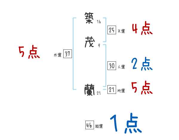 総運![]() | 築茂蘭さんの総運は46画の1つ星!迷走することが多く苦労するかも。目先のことにとらわれないように。 あなたの人生を表す1番重要な運勢です。生涯を通じて影響する総合運となり、主に50歳以降の晩年期に影響を及ぼします。 |