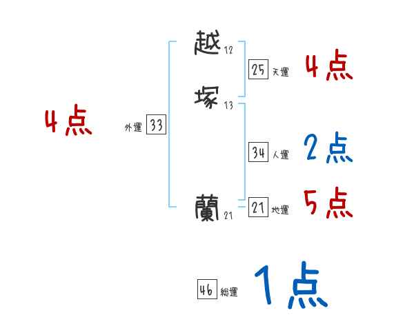 外運![]() | 越塚蘭さんの外運は33画の4つ星!権力志向でプライドが高い。勇気があり運を切り開き成功する。 生活面を象徴する運勢です。外部から受ける影響力を表し、結婚運、家庭運や職場、環境への順応性を表します。 |