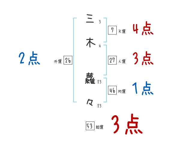 総運![]() | 三木蘿々さんの総運は53画の3つ星!やや見栄っ張りで虚栄心がある。散財に注意。 あなたの人生を表す1番重要な運勢です。生涯を通じて影響する総合運となり、主に50歳以降の晩年期に影響を及ぼします。 |