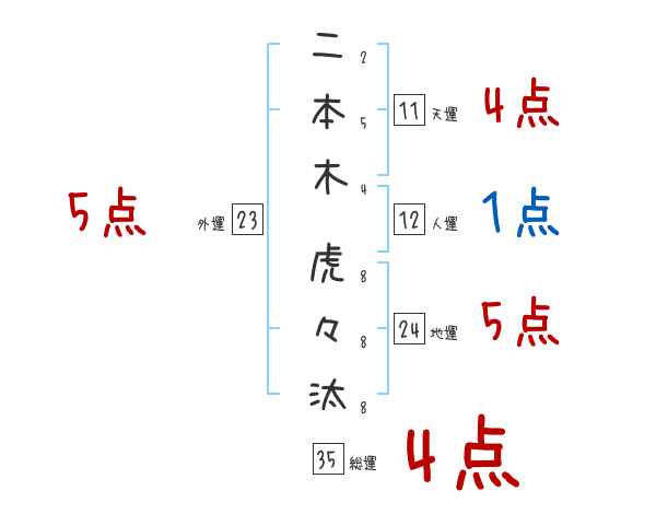 総運![]() | 二本木虎々汰さんの総運は35画の4つ星!温厚な性格で感受性が高い。穏和な性格で人望が厚い。 あなたの人生を表す1番重要な運勢です。生涯を通じて影響する総合運となり、主に50歳以降の晩年期に影響を及ぼします。 |