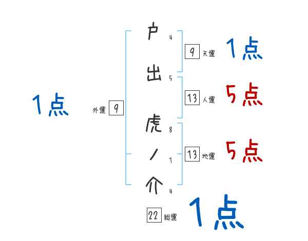 人運![]() | 戸出虎ノ介さんの人運は13画の5つ星!才能に恵まれ人気がある。名声を手に入れる。円満な人生。 性格や才能などを表す2番目に重要な運勢です。人間関係や協調性、社会的な成功に影響します。主に20歳から50歳ぐらいまでの中年期の運勢を表します。 |