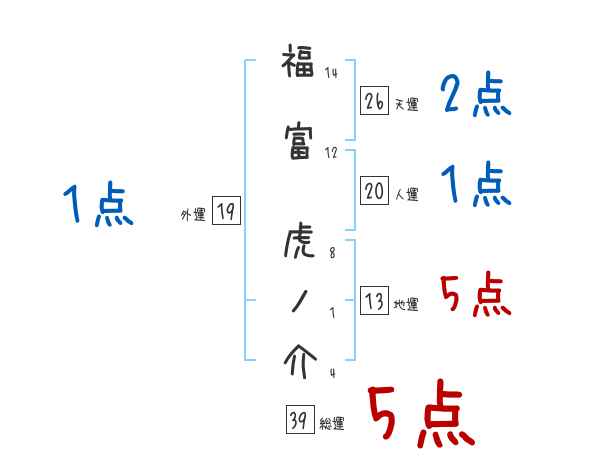 天運![]() | 福富虎ノ介さんの天運は26画の2つ星!波瀾万丈かも。信頼できる人を大事にしましょう。 家系が持つ宿命的な運勢を表します。祖先から受け継いだ苗字ですので自分の力が及びません。家柄を象徴します。 |