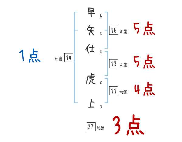 天運![]() | 早矢仕虎上さんの天運は16画の5つ星!人望が厚く大きく発展する。逆転成功が見える。 家系が持つ宿命的な運勢を表します。祖先から受け継いだ苗字ですので自分の力が及びません。家柄を象徴します。 |