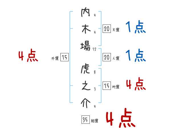 総運![]() | 内木場虎之介さんの総運は35画の4つ星!温厚な性格で感受性が高い。穏和な性格で人望が厚い。 あなたの人生を表す1番重要な運勢です。生涯を通じて影響する総合運となり、主に50歳以降の晩年期に影響を及ぼします。 |