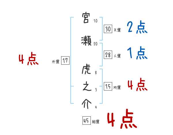 天運![]() | 宮瀬虎之介さんの天運は30画の2つ星!浮き沈みの激しさに注意しましょう。 家系が持つ宿命的な運勢を表します。祖先から受け継いだ苗字ですので自分の力が及びません。家柄を象徴します。 |