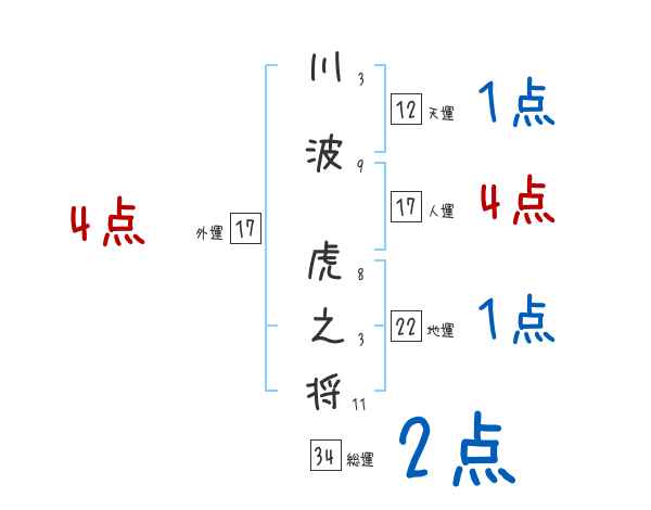総運![]() | 川波虎之将さんの総運は34画の2つ星!独創性に優れるが、自尊心が強く災難に注意しましょう。 あなたの人生を表す1番重要な運勢です。生涯を通じて影響する総合運となり、主に50歳以降の晩年期に影響を及ぼします。 |