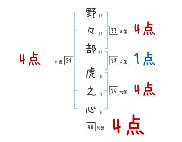 天運![]() | 野々部虎之心さんの天運は33画の4つ星!権力志向でプライドが高い。勇気があり運を切り開き成功する。 家系が持つ宿命的な運勢を表します。祖先から受け継いだ苗字ですので自分の力が及びません。家柄を象徴します。 |