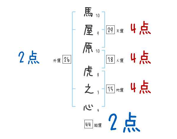 天運![]() | 馬屋原虎之心さんの天運は29画の4つ星!完全主義で才能がある。厳格な心の持ち主。 家系が持つ宿命的な運勢を表します。祖先から受け継いだ苗字ですので自分の力が及びません。家柄を象徴します。 |