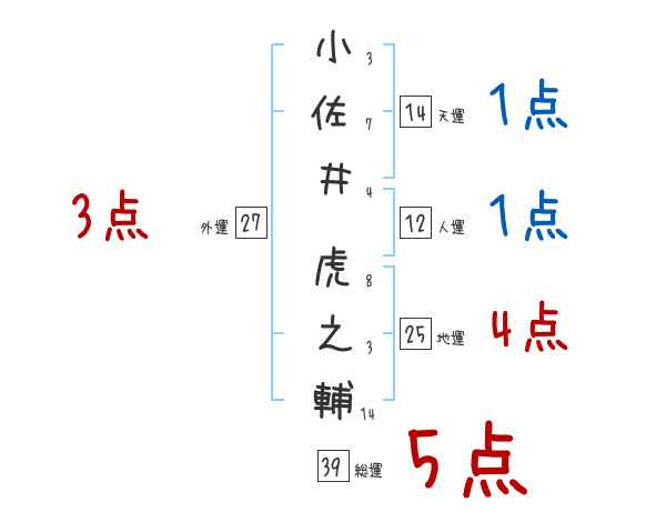 総運![]() | 小佐井虎之輔さんの総運は39画の5つ星!社交性に優れ人望が厚い。人の上に立ち成功する。 あなたの人生を表す1番重要な運勢です。生涯を通じて影響する総合運となり、主に50歳以降の晩年期に影響を及ぼします。 |
