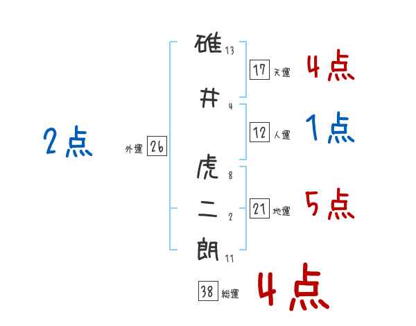 総運![]() | 碓井虎二朗さんの総運は38画の4つ星!温厚な性格で技術的な才能を発揮する。職人的な仕事に向いている。 あなたの人生を表す1番重要な運勢です。生涯を通じて影響する総合運となり、主に50歳以降の晩年期に影響を及ぼします。 |