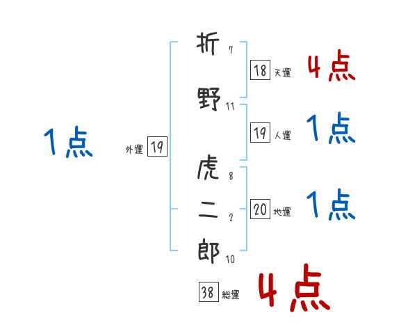 外運![]() | 折野虎二郎さんの外運は19画の1つ星!優れた才能を持ちますが、協調性が足りないことも。周りの人と協力する事を意識しましょう。 生活面を象徴する運勢です。外部から受ける影響力を表し、結婚運、家庭運や職場、環境への順応性を表します。 |