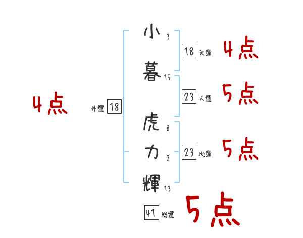 天運![]() | 小暮虎力輝さんの天運は18画の4つ星!情熱的で剛気。忍耐力があり信頼される。 家系が持つ宿命的な運勢を表します。祖先から受け継いだ苗字ですので自分の力が及びません。家柄を象徴します。 |