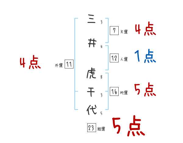 天運![]() | 三井虎千代さんの天運は7画の4つ星!強い意志や信念を持ち独立心が強い。自立する。 家系が持つ宿命的な運勢を表します。祖先から受け継いだ苗字ですので自分の力が及びません。家柄を象徴します。 |