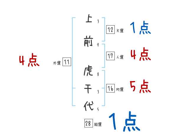 総運![]() | 上前虎千代さんの総運は28画の1つ星!家庭環境に注意。スポーツで活躍できる能力があるかも。 あなたの人生を表す1番重要な運勢です。生涯を通じて影響する総合運となり、主に50歳以降の晩年期に影響を及ぼします。 |