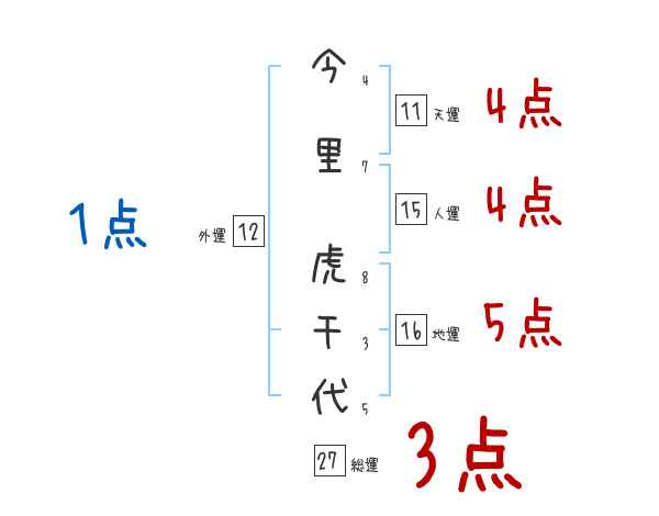 天運![]() | 今里虎千代さんの天運は11画の4つ星!着実に富や地位を得る幸運な人生。 家系が持つ宿命的な運勢を表します。祖先から受け継いだ苗字ですので自分の力が及びません。家柄を象徴します。 |