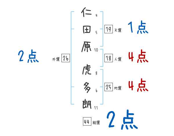 総運![]() | 仁田原虎多朗さんの総運は44画の2つ星!誠実で慎重な性格。物事を考えすぎないように注意しましょう。 あなたの人生を表す1番重要な運勢です。生涯を通じて影響する総合運となり、主に50歳以降の晩年期に影響を及ぼします。 |