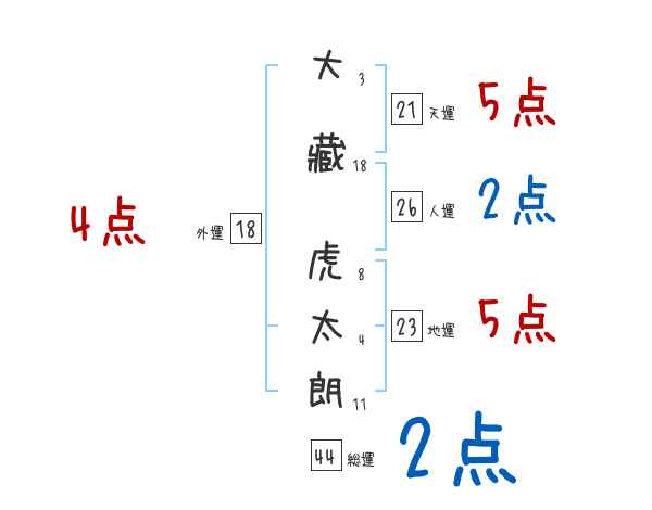 天運![]() | 大藏虎太朗さんの天運は21画の5つ星!統率力がある。独立し成功する。名誉を手に入れる。 家系が持つ宿命的な運勢を表します。祖先から受け継いだ苗字ですので自分の力が及びません。家柄を象徴します。 |