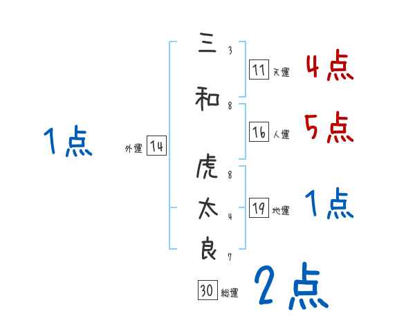 外運![]() | 三和虎太良さんの外運は14画の1つ星!人に対して優しいがストレスを溜め込みがち。人間関係のトラブルを避けるよう気をつけましょう。 生活面を象徴する運勢です。外部から受ける影響力を表し、結婚運、家庭運や職場、環境への順応性を表します。 |