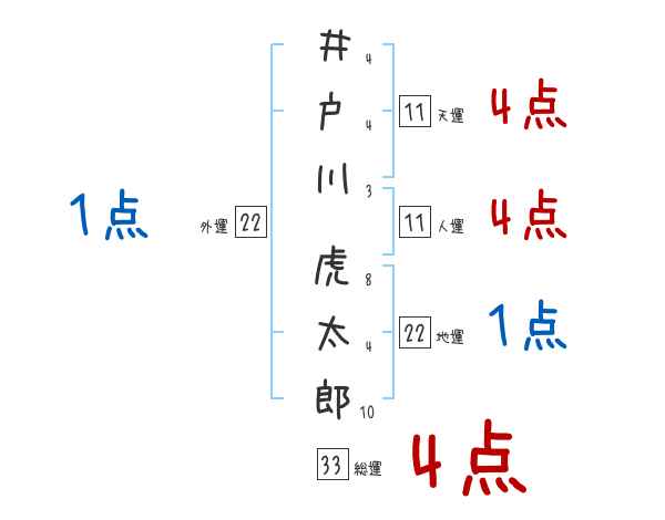 外運![]() | 井戸川虎太郎さんの外運は22画の1つ星!努力することが苦手ないっぽう手先が器用。芸術性にも優れる。 生活面を象徴する運勢です。外部から受ける影響力を表し、結婚運、家庭運や職場、環境への順応性を表します。 |