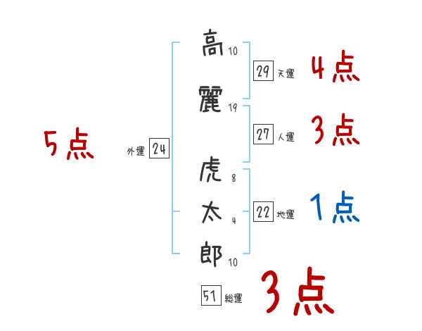 総運![]() | 高麗虎太郎さんの総運は51画の3つ星!変化が激しく、危険に注意。堅実な性格。 あなたの人生を表す1番重要な運勢です。生涯を通じて影響する総合運となり、主に50歳以降の晩年期に影響を及ぼします。 |