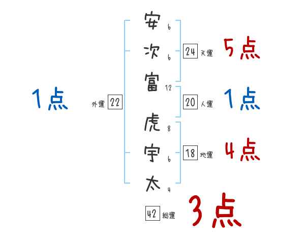 天運![]() | 安次富虎宇太さんの天運は24画の5つ星!家庭運が良く順調な人生。金運にも恵まれる。 家系が持つ宿命的な運勢を表します。祖先から受け継いだ苗字ですので自分の力が及びません。家柄を象徴します。 |