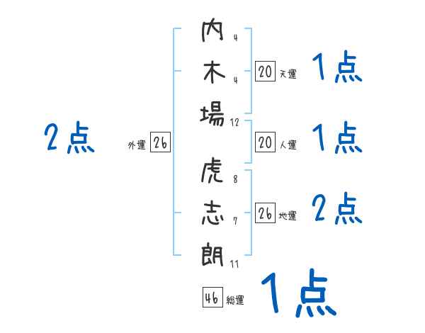 外運![]() | 内木場虎志朗さんの外運は26画の2つ星!波瀾万丈かも。信頼できる人を大事にしましょう。 生活面を象徴する運勢です。外部から受ける影響力を表し、結婚運、家庭運や職場、環境への順応性を表します。 |