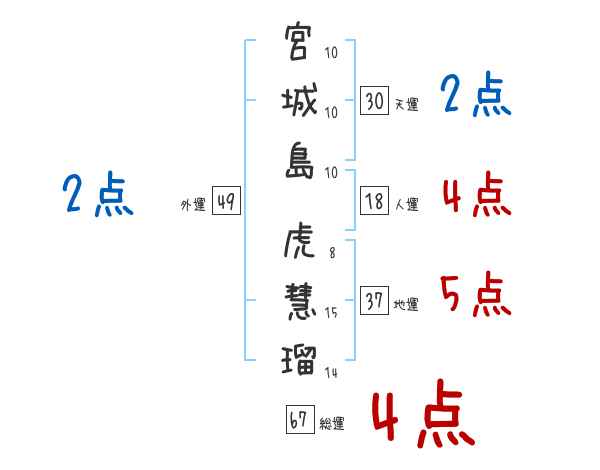 天運![]() | 宮城島虎慧瑠さんの天運は30画の2つ星!浮き沈みの激しさに注意しましょう。 家系が持つ宿命的な運勢を表します。祖先から受け継いだ苗字ですので自分の力が及びません。家柄を象徴します。 |