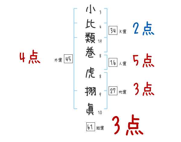 天運![]() | 小比類巻虎挧眞さんの天運は34画の2つ星!独創性に優れるが、自尊心が強く災難に注意しましょう。 家系が持つ宿命的な運勢を表します。祖先から受け継いだ苗字ですので自分の力が及びません。家柄を象徴します。 |
