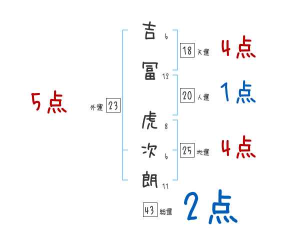 総運![]() | 吉冨虎次朗さんの総運は43画の2つ星!頑固な性格で独立心が強いかも。やや非現実的で浪費に注意しましょう。 あなたの人生を表す1番重要な運勢です。生涯を通じて影響する総合運となり、主に50歳以降の晩年期に影響を及ぼします。 |