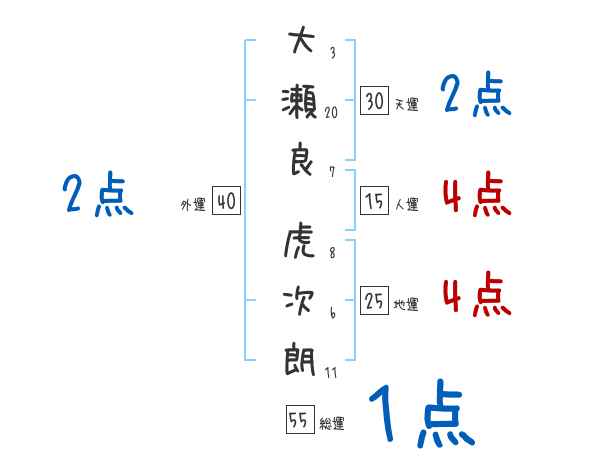 天運![]() | 大瀬良虎次朗さんの天運は30画の2つ星!浮き沈みの激しさに注意しましょう。 家系が持つ宿命的な運勢を表します。祖先から受け継いだ苗字ですので自分の力が及びません。家柄を象徴します。 |