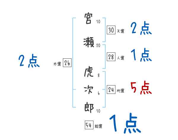 天運![]() | 宮瀬虎次郎さんの天運は30画の2つ星!浮き沈みの激しさに注意しましょう。 家系が持つ宿命的な運勢を表します。祖先から受け継いだ苗字ですので自分の力が及びません。家柄を象徴します。 |