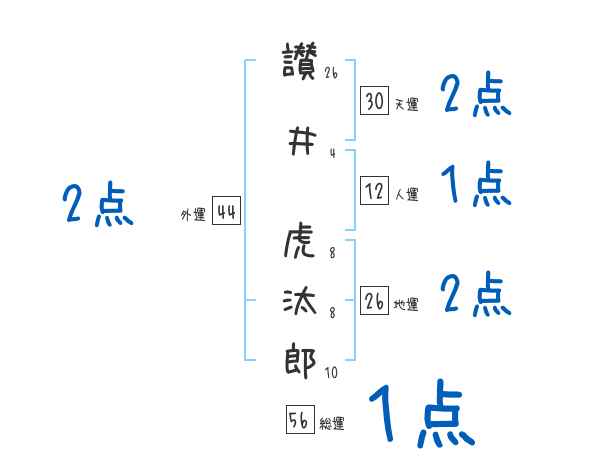 天運![]() | 讃井虎汰郎さんの天運は30画の2つ星!浮き沈みの激しさに注意しましょう。 家系が持つ宿命的な運勢を表します。祖先から受け継いだ苗字ですので自分の力が及びません。家柄を象徴します。 |