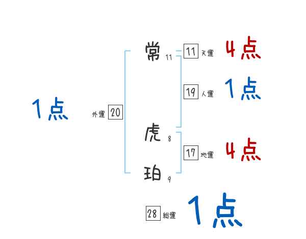 天運![]() | 常虎珀さんの天運は11画の4つ星!着実に富や地位を得る幸運な人生。 家系が持つ宿命的な運勢を表します。祖先から受け継いだ苗字ですので自分の力が及びません。家柄を象徴します。 |