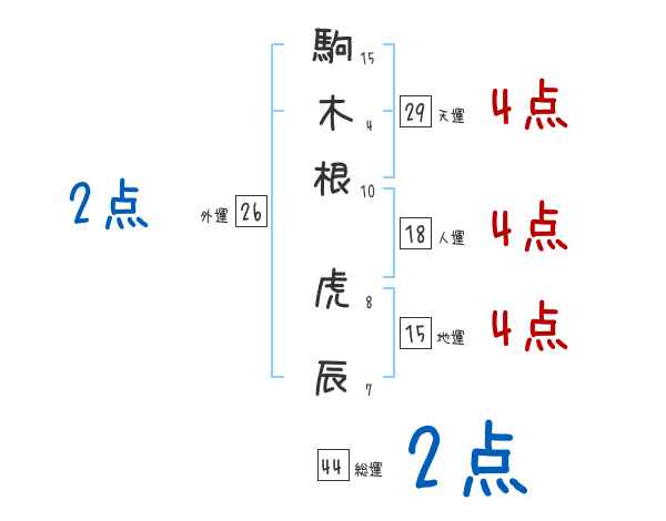 総運![]() | 駒木根虎辰さんの総運は44画の2つ星!誠実で慎重な性格。物事を考えすぎないように注意しましょう。 あなたの人生を表す1番重要な運勢です。生涯を通じて影響する総合運となり、主に50歳以降の晩年期に影響を及ぼします。 |