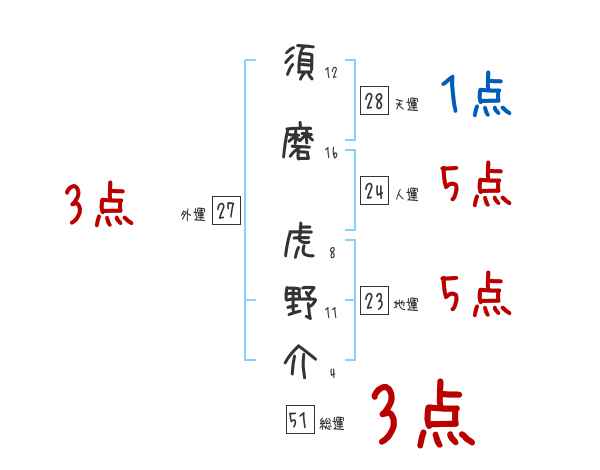 人運![]() | 須磨虎野介さんの人運は24画の5つ星!家庭運が良く順調な人生。金運にも恵まれる。 性格や才能などを表す2番目に重要な運勢です。人間関係や協調性、社会的な成功に影響します。主に20歳から50歳ぐらいまでの中年期の運勢を表します。 |