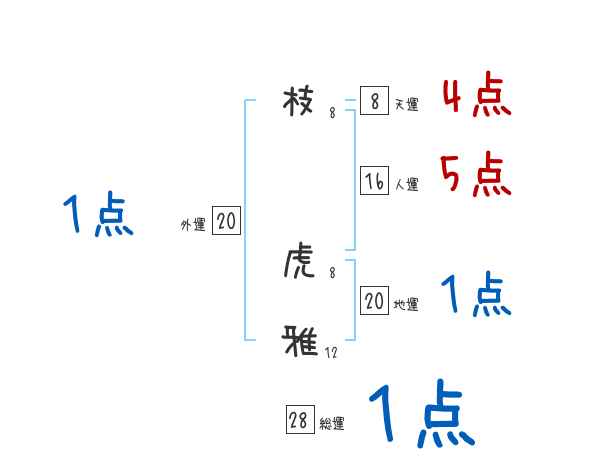 総運![]() | 枝虎雅さんの総運は28画の1つ星!家庭環境に注意。スポーツで活躍できる能力があるかも。 あなたの人生を表す1番重要な運勢です。生涯を通じて影響する総合運となり、主に50歳以降の晩年期に影響を及ぼします。 |