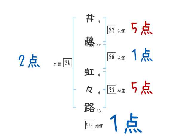 人運![]() | 井藤虹々路さんの人運は28画の1つ星!家庭環境に注意。スポーツで活躍できる能力があるかも。 性格や才能などを表す2番目に重要な運勢です。人間関係や協調性、社会的な成功に影響します。主に20歳から50歳ぐらいまでの中年期の運勢を表します。 |