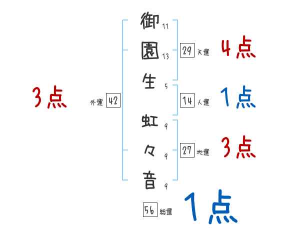 地運![]() | 御園生虹々音さんの地運は27画の3つ星!頭脳明晰だが強情で摩擦が多い傾向。孤立に注意。 個性を表す基礎的な運勢です。性格形成や対人関係、行動力など家庭環境に影響されます。主に誕生してから20歳くらいまでの若年期の運勢を表します。 |
