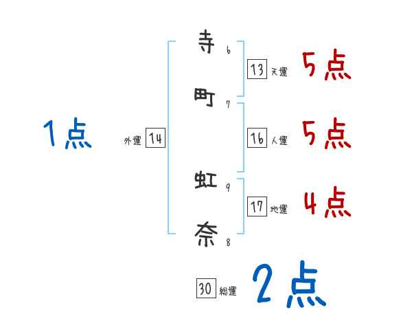 人運![]() | 寺町虹奈さんの人運は16画の5つ星!人望が厚く大きく発展する。逆転成功が見える。 性格や才能などを表す2番目に重要な運勢です。人間関係や協調性、社会的な成功に影響します。主に20歳から50歳ぐらいまでの中年期の運勢を表します。 |