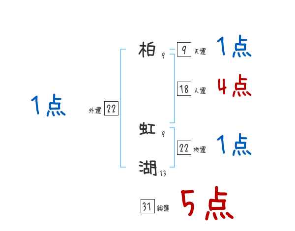天運![]() | 柏虹湖さんの天運は9画の1つ星!消極的で才能を発揮することが苦手なことも。周りの意見に耳を傾けましょう。 家系が持つ宿命的な運勢を表します。祖先から受け継いだ苗字ですので自分の力が及びません。家柄を象徴します。 |