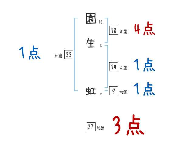 天運![]() | 園生虹さんの天運は18画の4つ星!情熱的で剛気。忍耐力があり信頼される。 家系が持つ宿命的な運勢を表します。祖先から受け継いだ苗字ですので自分の力が及びません。家柄を象徴します。 |