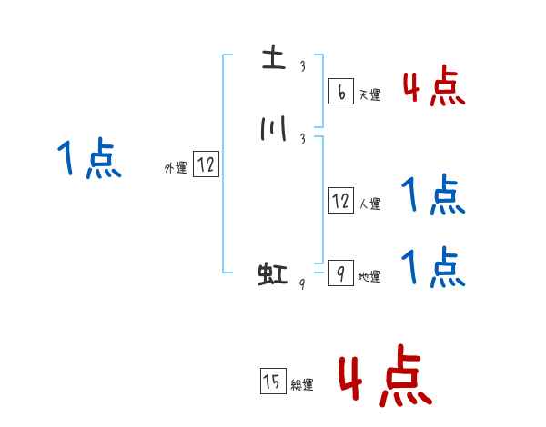 天運![]() | 土川虹さんの天運は6画の4つ星!慎重な努力家で信頼を得る。誠実な精神で向上心に優れる。 家系が持つ宿命的な運勢を表します。祖先から受け継いだ苗字ですので自分の力が及びません。家柄を象徴します。 |