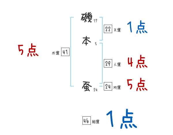 人運![]() | 磯本蚕さんの人運は29画の4つ星!完全主義で才能がある。厳格な心の持ち主。 性格や才能などを表す2番目に重要な運勢です。人間関係や協調性、社会的な成功に影響します。主に20歳から50歳ぐらいまでの中年期の運勢を表します。 |