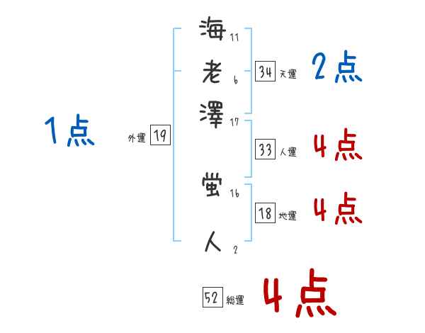 人運![]() | 海老澤蛍人さんの人運は33画の4つ星!権力志向でプライドが高い。勇気があり運を切り開き成功する。 性格や才能などを表す2番目に重要な運勢です。人間関係や協調性、社会的な成功に影響します。主に20歳から50歳ぐらいまでの中年期の運勢を表します。 |