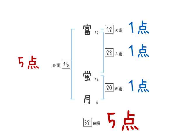 総運![]() | 富蛍月さんの総運は32画の5つ星!柔軟性があり成功する。チャンスが多く金運が良い。 あなたの人生を表す1番重要な運勢です。生涯を通じて影響する総合運となり、主に50歳以降の晩年期に影響を及ぼします。 |