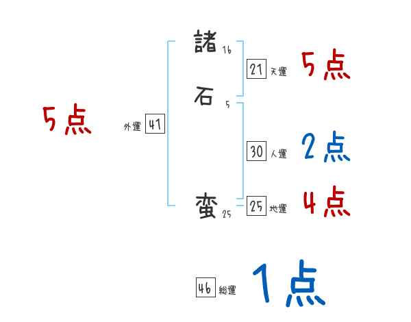 天運![]() | 諸石蛮さんの天運は21画の5つ星!統率力がある。独立し成功する。名誉を手に入れる。 家系が持つ宿命的な運勢を表します。祖先から受け継いだ苗字ですので自分の力が及びません。家柄を象徴します。 |
